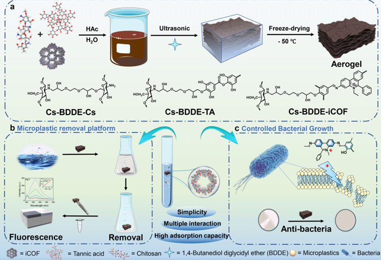 微塑料作为一种新兴污染物,因其比表面积大、易吸附其他污染物且难以降解等特性,对生态系统和人体健康构成严重威胁。针对现有微塑料去除材料成本高、难以回收、易造成二次污染等问题,本研究设计并合成了一种阳离子共价有机框架增强的壳聚糖/单宁酸气凝胶。该气凝胶通过静电作用、氢键和π-π堆积等多重协同作用,可高效捕获水中多种微塑料,并对聚乙烯对苯二甲酸酯、聚苯乙烯和聚碳酸酯表现出优异的吸附容量。同时,材料具备显著的抗菌和抗真菌性能,可有效防止生物沉积,实现长期稳定运行。在实际水样测试中,该气凝胶对微塑料的去除率超过70%,展现了良好的应用潜力。